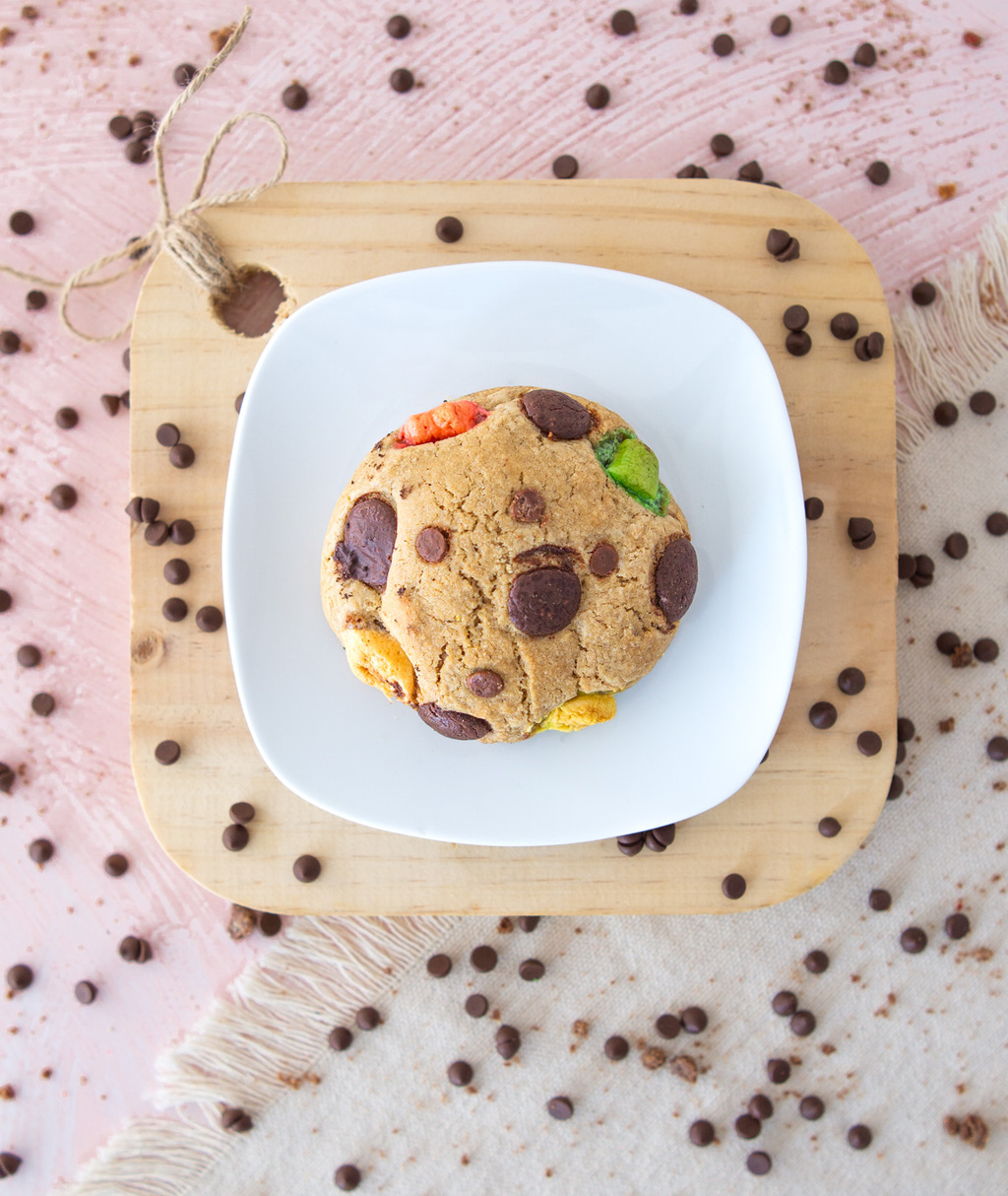 Galleta de chocolate con chips de colores que alegran como una fiesta. Un detalle dulce que siempre alegra el día